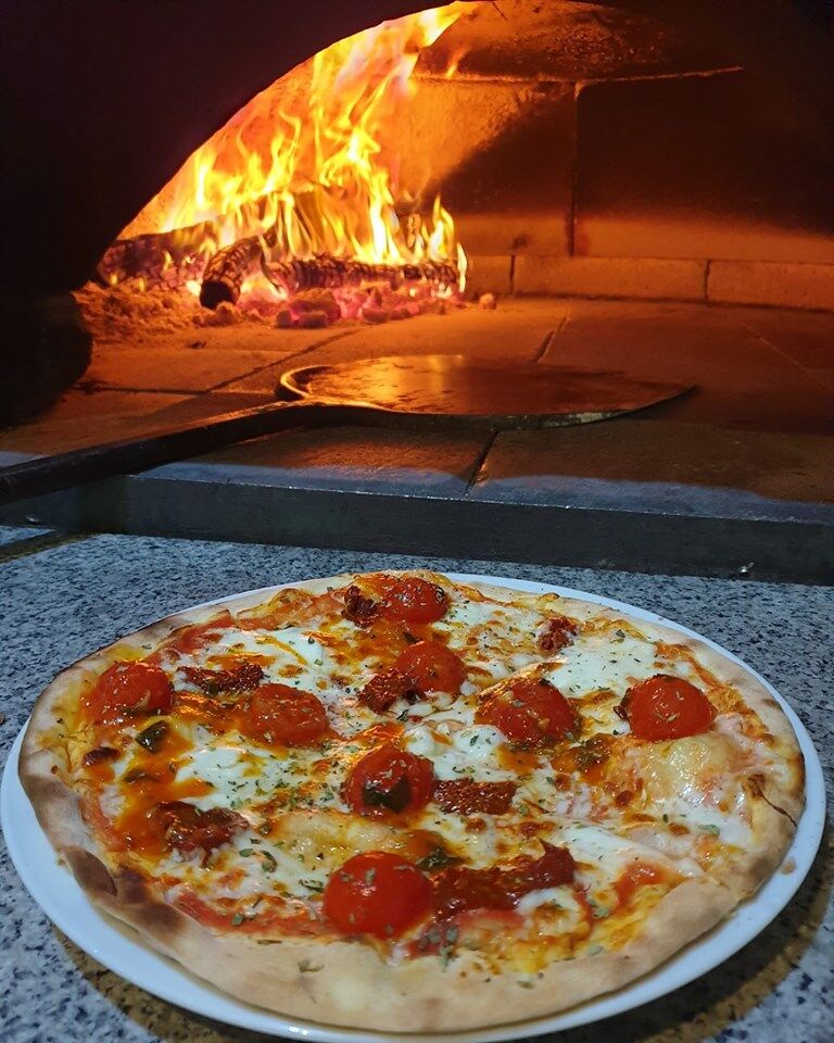 O que nos distingue é a confeção das nossas pizzas, feitas em forno a lenha com receitas totalmente artesanais.